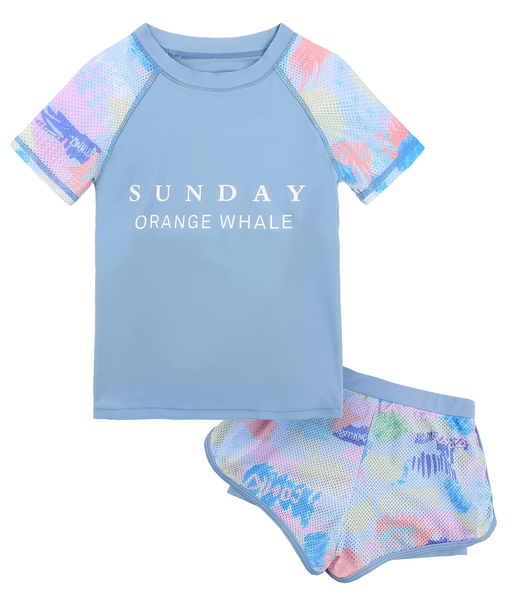 Girls Two Pieces Rash Guard Swimsuit Set Short Sleeve Swimwear Bathing Suit